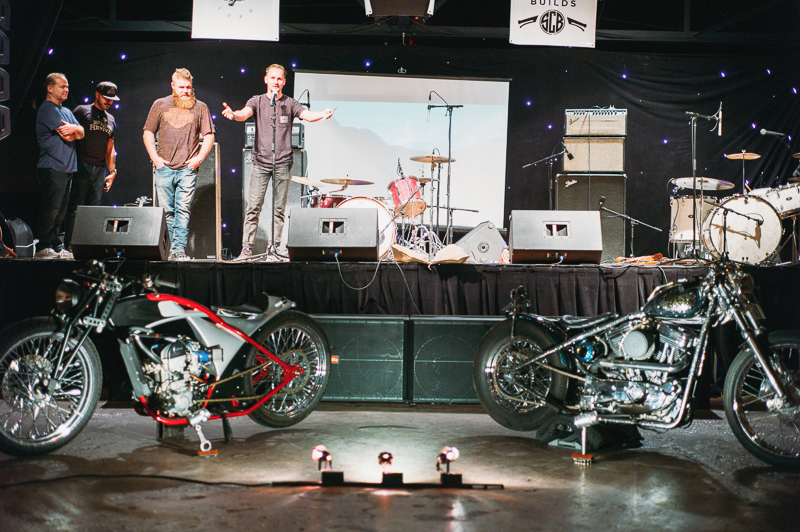 Jason “Rev” Clark announces the winners of the bike building contest: Don Cash for individual builds, and Adam Paul and Ryan Friedli for the invited builds class. Photo: @clancycoop