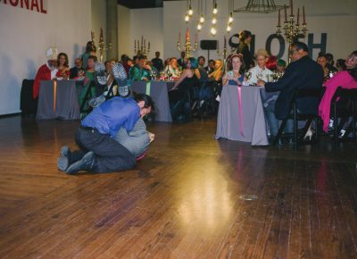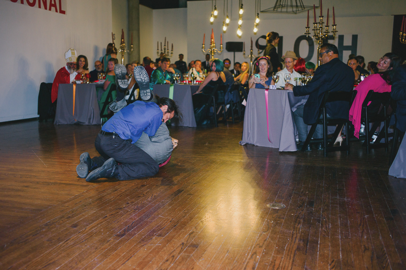 The sins were displayed on the walls of the event in tall script, and UMOCA arranged for their own living display of some of the sins as well. Lust was embodied by a tall redheaded woman in a red formal dress, slinking around silently, winking indiscriminately at guests. Sloth was embodied by a young man in a blue shirt carrying around a pillow and laying down for catnaps in the middle of the dance floor or next to the line for cocktails. Gluttony had all types of candy pinned to his clothing, and wandered the party encouraging guests to partake of his delicious outfit. In case guests were experiencing guilt, a pope was on hand at a confessional for quick and easy absolution.