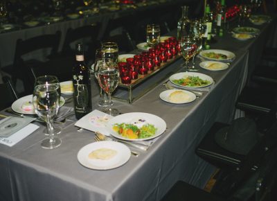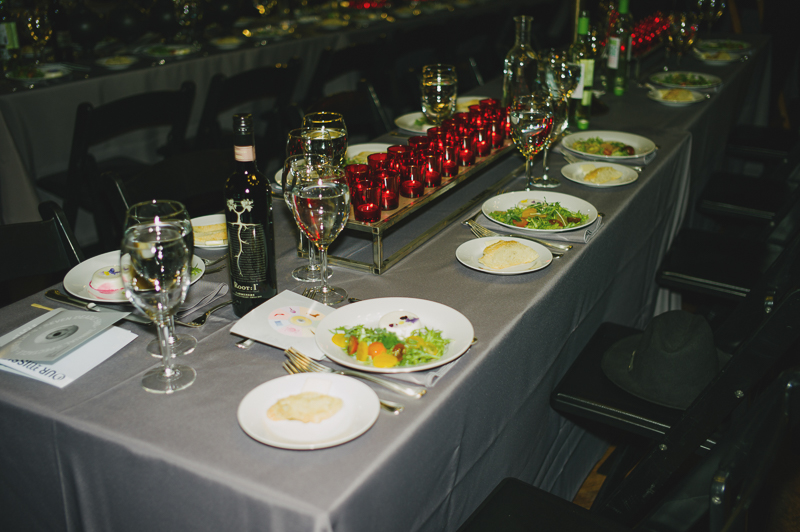 The proceedings included a silent auction for all types of art, much of it created by local artists who have participated in UMOCA‘s Artist-In-Residence program. Also auctioned were trips to Chicago, Austin and New York City. There were performances of acro yoga and dance, as well as more avant-garde displays such as a mock fight between two “servers” illustrating the sin of wrath. The Blended Table served delectable food including seared ahi served cold with savory black rice pudding, tobiko and avocado butter as well as roasted beet napoleon with spring pea jus, wheat berries, goat chevre crema and chili oil droplets.