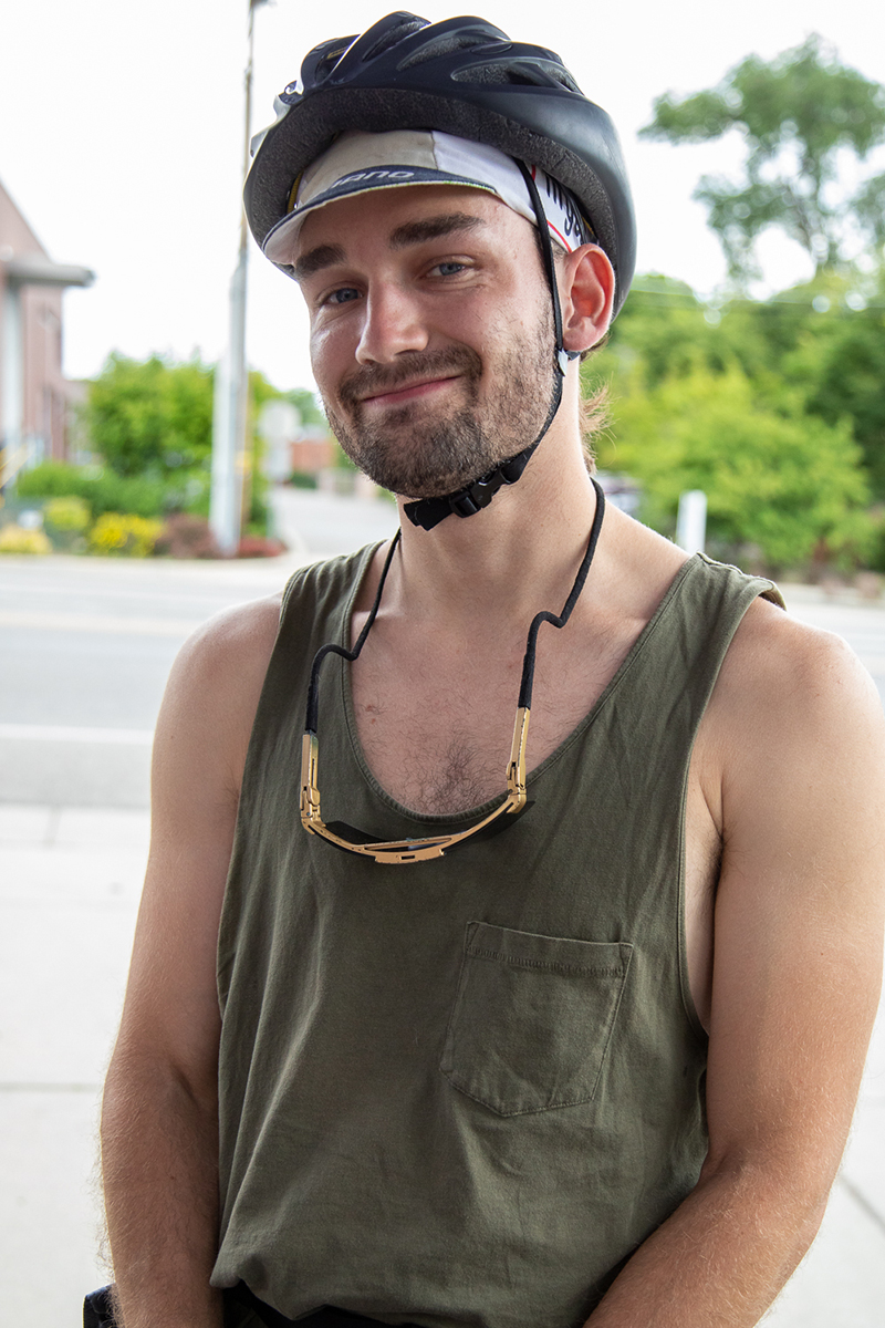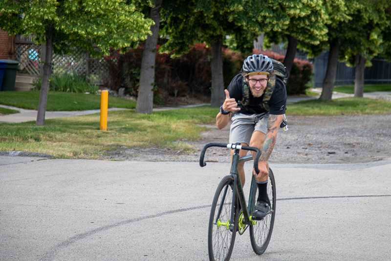 Pete Watson learned about SLUG Cat from a flyer in a coffee shop. He’s visiting Salt Lake from Grand Rapids, Michigan, where sub-par roads filled with potholes keep him on his toes. Photo: Kaylynn Gonazlez