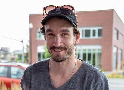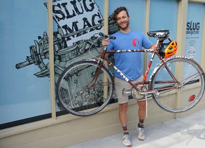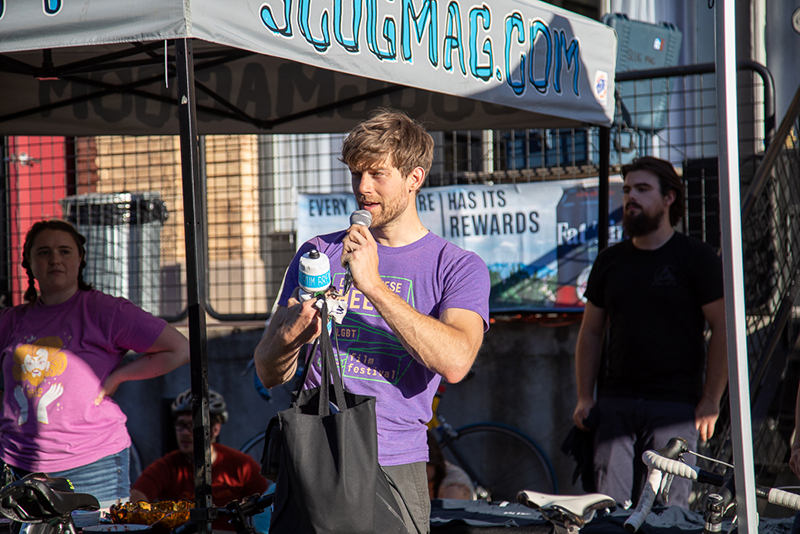 Matty Coles scored a gift bag for finishing dead fucking last. It’s a dubious honor at SLUG Magazine’s alley cat race. Photo: Kaylynn Gonazlez