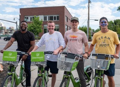 (L–R) Akiode Udonton, Michael Moody, Luke Pyper and Matt Wood grabbed some SLC Green Bikes for the SLUG Cat. Wood wasn’t too shy to “rawr” with that dino on his face. Photo: John Barkiple