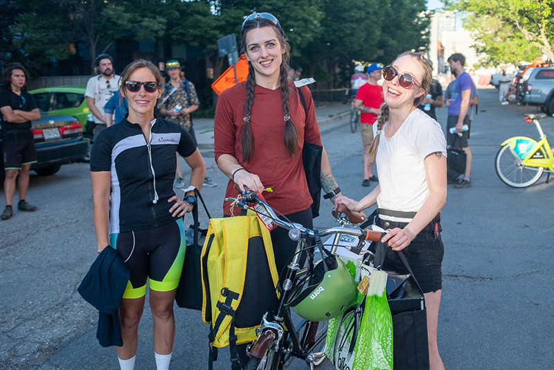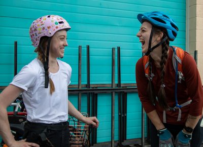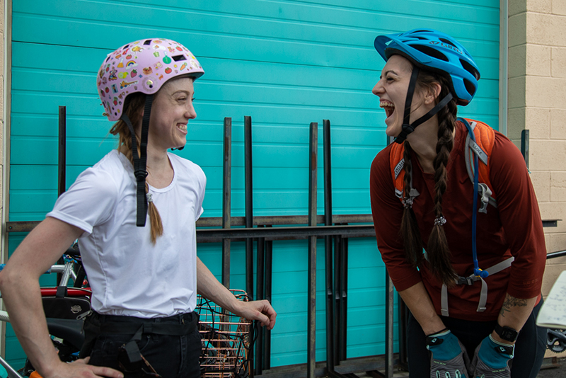 (L–R) Renée Draper and Marian Lewis share a pre-race joke. First time alley-cater and first-place finisher Draper heard about the race from her work pal, Scott Morely. That the alley cat is like a scavenger hunt appeals to her game-loving personality. Third-place finisher Lewis rode a rental in SLUG Cat 2019. She joined the race today because she loves the social aspect of a good bike gathering. Photo: Kaylynn Gonazlez