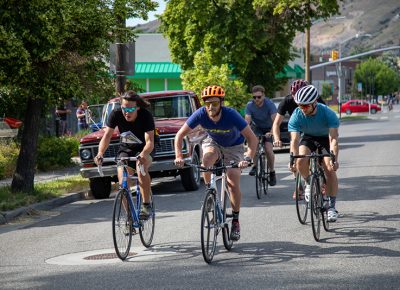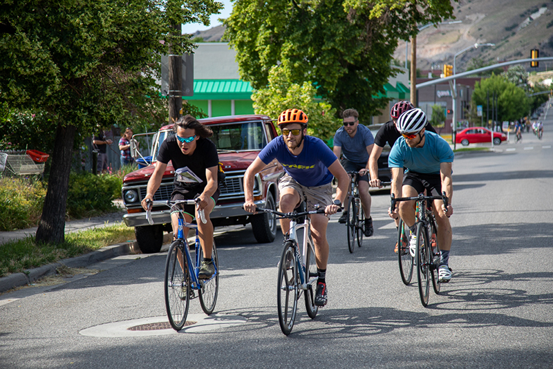 Alicia Chen, first-place finisher Clint Campbell, Pete Watson, Aaron Larson and second-place finisher Carlos Garcia complete an apple-themed task at Mountain West Hard Cider. Chen didn’t expect the 2019 SLUG Cat to sting as much as it did. The headwind and mileage convinced her to bring her fast bike next year—and bib shorts. Photo: Kaylynn Gonazlez