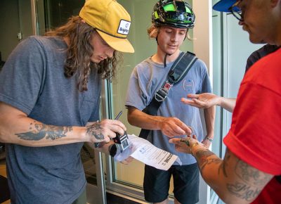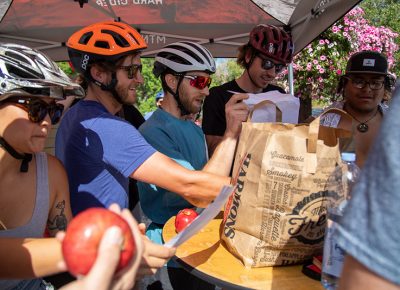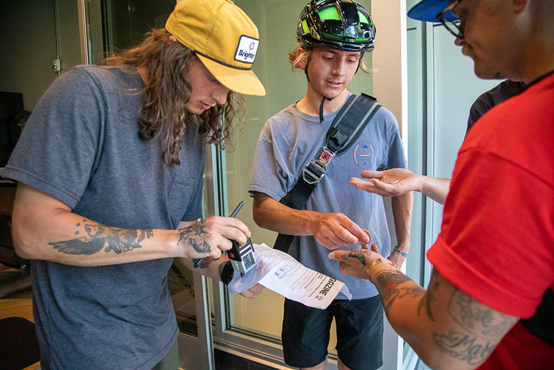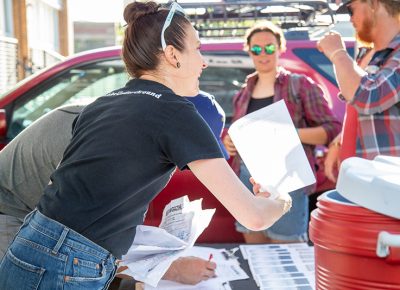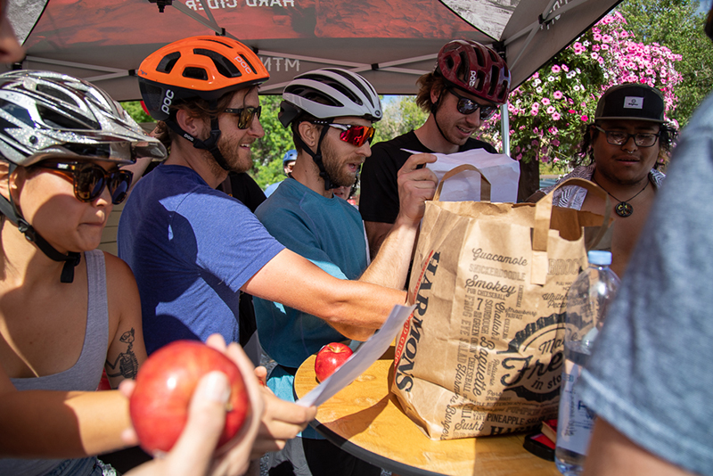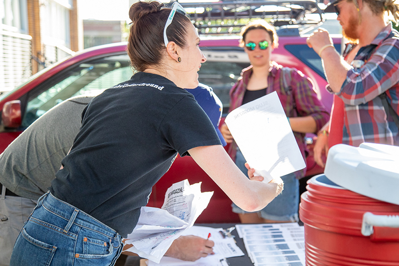 SLUG Magazine’s Angela Brown collects manifests as SLUG Cat racers arrive at SLUG HQ, where racers receive Fat Tire apparel and New Belgium Brewery water bottles. Photo: Kaylynn Gonazlez