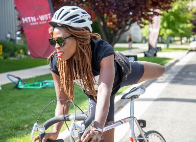 Three-time SLUG Cat champion Nkenna Onwuzuruoha dismounts at Mountain West Hard Cider to earn a stamp on her manifest. Photo: Kaylynn Gonazlez