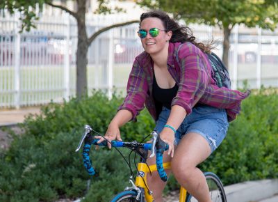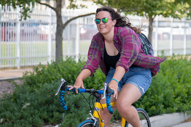 Natalie Kane rides on North Temple as she looks for the SLUG Cat check-in station at the State Fairpark. Photo: Kaylynn Gonazlez
