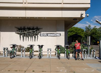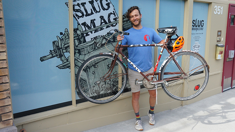 First-place winner Clint Campbell poses with his prize bike in front of the SLUG offices. Photo: Joshua Joye
