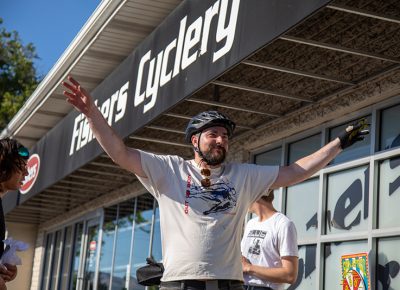 Christian Riley knocks out seven jumping jacks at Fishers Cyclery before earning a stamp on his manifest. Riley broke his chain right after this stop, but Fishers installed a fresh one to keep him in the race. Photo: Kaylynn Gonazlez