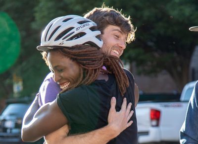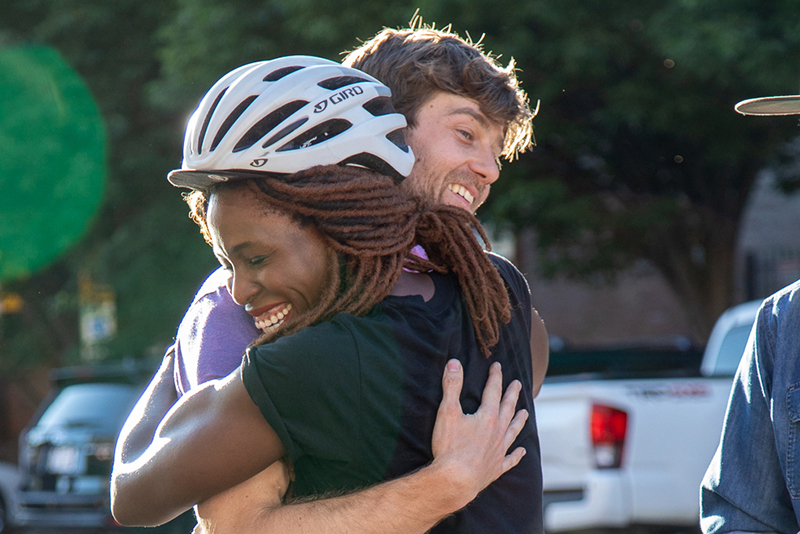 (L–R) Nkenna Onwuzuruoha hugs Davey Davis. She mis-mapped her manifest, so she didn’t reach the podium, but she still finished with a smile. Davis handicapped himself in today’s race by riding SLUG’s old beater bike. Photo: Kaylynn Gonazlez