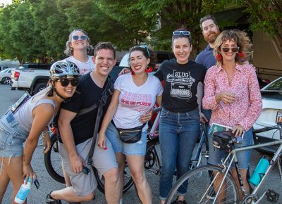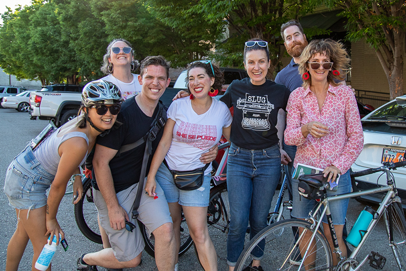 (L–R) Alicia Chen, Chrissy Upton, Ian Greaves, Jennifer Ortiz, SLUG Magazine’s Angela Brown, Jason Brower and Sabrina Sanders relax after the 2019 SLUG Cat. Photo: Kaylynn Gonazlez