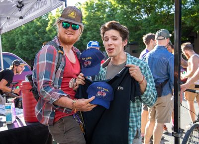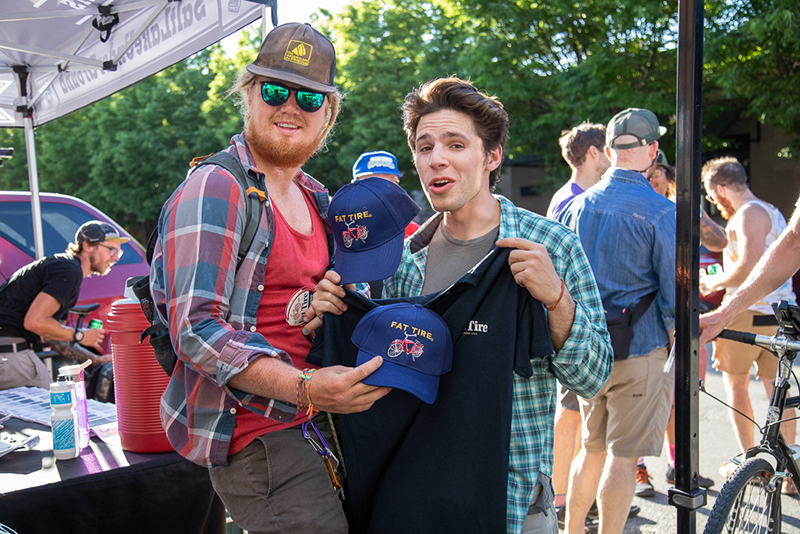 (L–R) Kent Boardman and Adrian Martin score some Fat Tire hats and shirts at SLUG Cat. Photo: Kaylynn Gonazlez