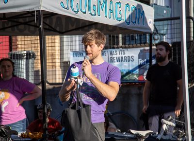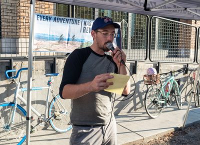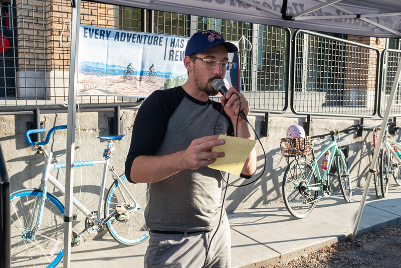 SLUG Magazine’s Event Coordinator, John Platt, announces the winners of the 2019 SLUG Cat. The race was sponsored by Blue Copper Coffee, Fishers Cyclery, Graywhale, SLC Bike Share, Mountain West Hard Cider, New Belgium Brewing, Pig & a Jelly Jar, Proper Brewing Co. and Saturday Cycles. Photo: John Barkiple