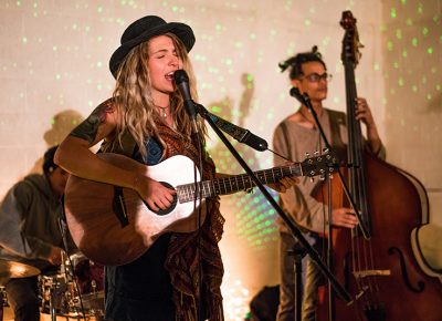 Osis, a jazz ensemble, played the first set. Shanin Blake and the Shakes played a two-hour set next on a cleverly constructed pallet stage near the entrance of the space. The music was funky and upbeat, yet not overpowering the remainder of the gallery for those strolling and pondering the art installations.