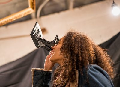 Darby Mest looking through stereo viewers in Tom Shrieve’s exhibit. Photo: Jo Savage // @SavageDangerWolf