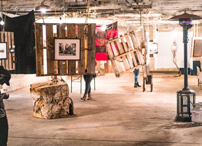 Friday evening, people sipped delicious craft beer at the taphouse while talking and playing darts. Venturing outside, people congregated by a fire pit, and Layton’s Daily Rise Coffee served hot coffee. A wooden sign reading “Shades of Entropy” hung over the entrance to the back warehouse. Once inside, the warehouse space was converted into a beautiful art gallery with 16 various exhibits. Pallets hanging above the rafters displayed art—some artists constructed their own displays from fencing, tapestries and more.