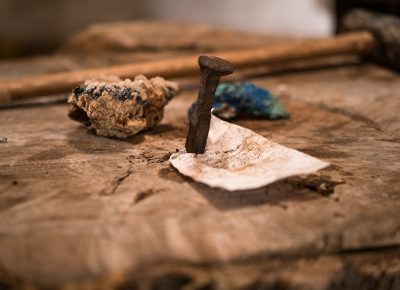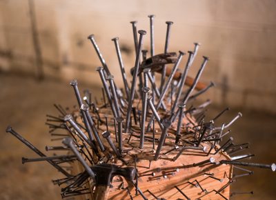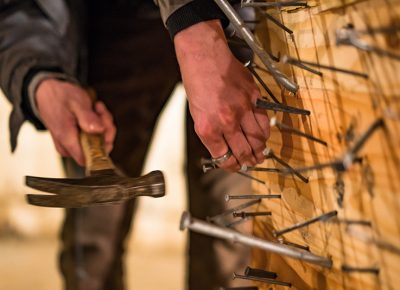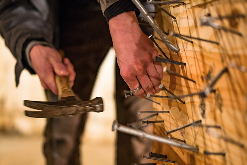Another portion of Bobby’s interactive exhibit included this wooden block to hammer nails into to demonstrate and release your stress. Apparently, this was “a hit.” Photo: Jo Savage // @SavageDangerWolf