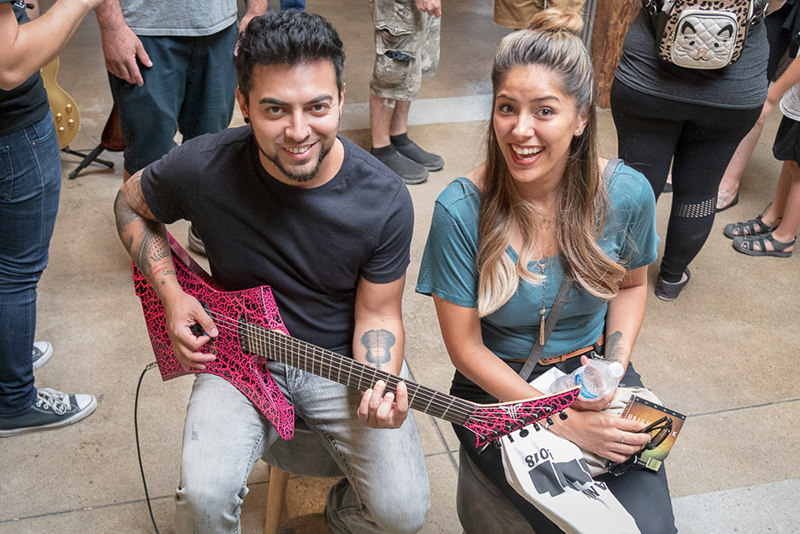 (L–R) Randy Perea and Mireya Medina take a look at Rob Gray’s pointy guitars. After playing, what does Perea like? “The color, of course.” Gray builds multi-scale and extended-range seven- and eight-stringed guitars, and he likes ’em colorful and pointy.