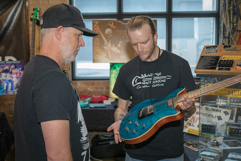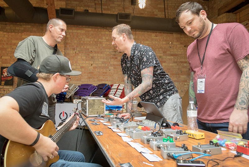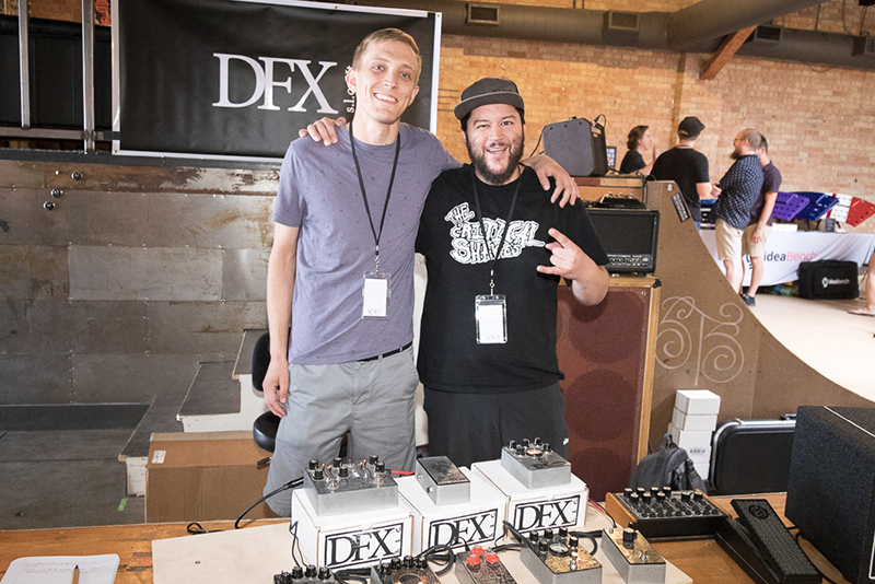 (L–R) DFX’s Brad Burnell points out features of the “F.M. Fuzz” effects pedal while Tyler Gipson takes it for a spin. Gipson plays in Esther Lane and has a solo project called Weasel Fever that’s pure metal.