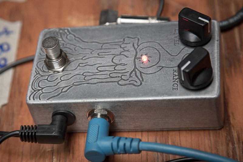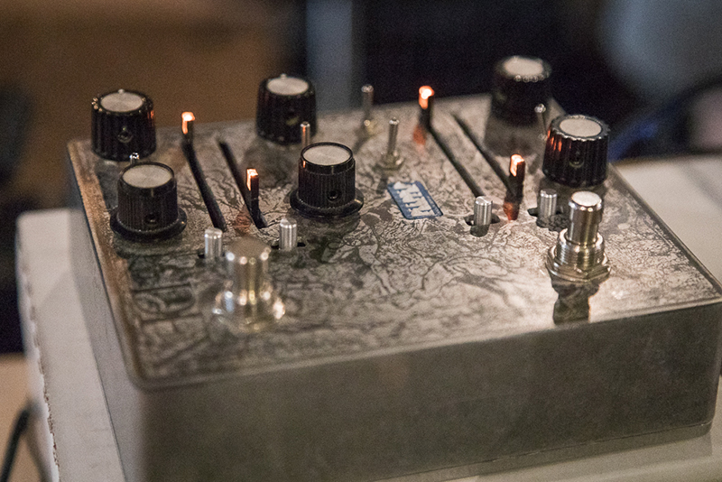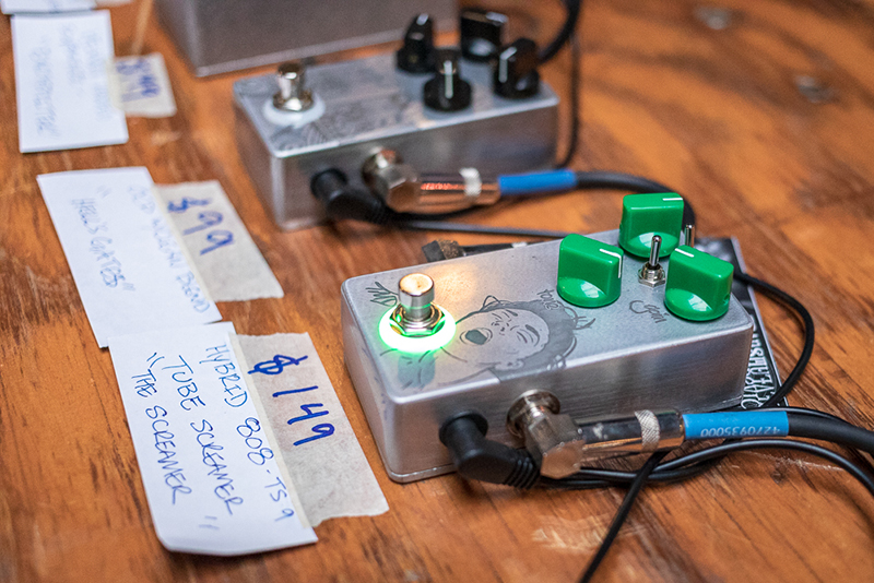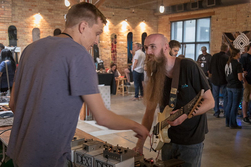 (L–R) Shea Sterner (second from right) and Mark Wursten (right) from Transmutation Devices brought a large selection of effects pedals to SLAMM. Their “Candlelight” pedal is similar to a “Range Master,” but it distorts more than just treble. They offer many pedal flavors in boosts, overdrives, fuzzes, distortions, delays and pre-amps. And with maker flair, they also etch their own boxes and operate from Sterner’s basement and Wursten’s kitchen.
