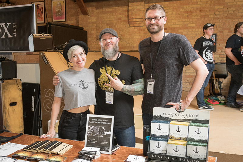 (L–R) Lizzy Tanner, Cory Jensen and Drew Ehrgott bring Black Harbor’s strings to SLAMM. Jensen, a serial entrepreneur, designs his strings for better action at the pickups, and his custom blend of alloys prevents the additional fret wear that could occur. Find out more @blackharborsound.