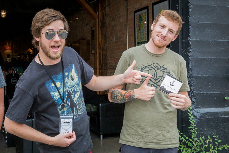 (L–R) Ben Gabrielsen and Alec Stanczyk step outside to take a break from SLAMM’s heady buzz. Stanczyk bought Black Harbor strings, which he’ll use when he plays in his band, Hemwick, up in Ogden.