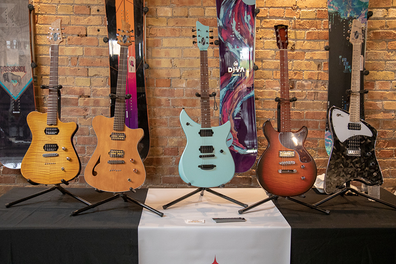 This blue guitar from Joe’s Guitars at center has a 24-inch scale length, inspired by Kurt Cobain, who preferred to play this style of guitar tuned down.