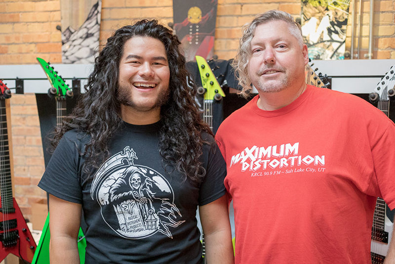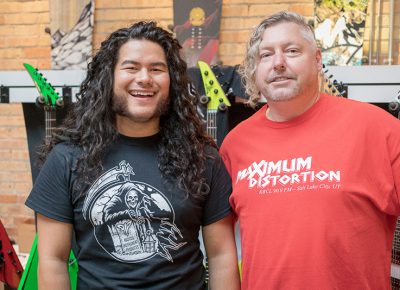 SLAMM organizer Rob Gray and KRCL DJ Cody D. talk guitars at Gray’s booth. Cody D. co–hosts KRCL’s metal show, Maximum Distortion, Wednesdays from 10:30 p.m.–1 a.m. with John Forgach. Cody D. owns guitars, but he’s a drummer at heart