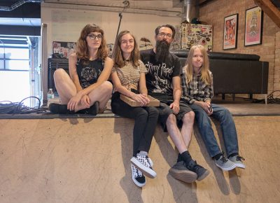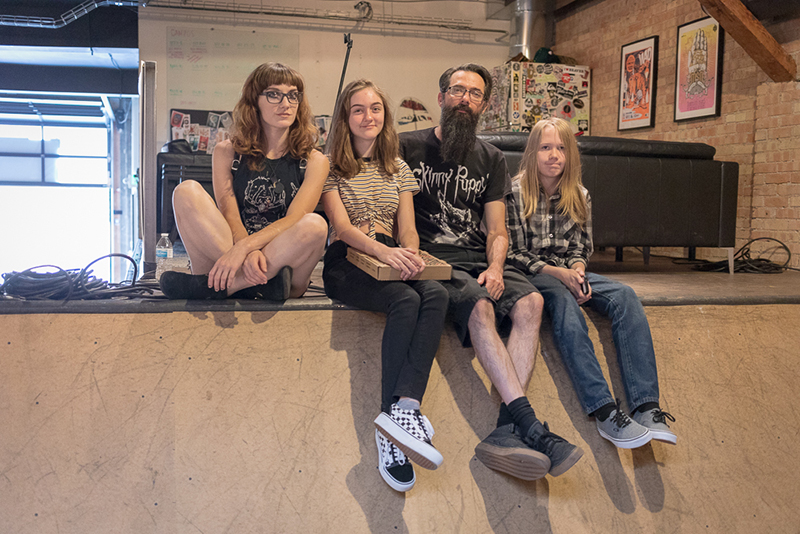 (L–R) Erin Stout, Trinity Perry, James Perry and Lucian Perry relax on Super Top Secret’s skate ramp during SLAMM’s inaugural event. James likes what he sees, but he would like to see more modular synths next year. Trinity sings for the Mona Lizards.
