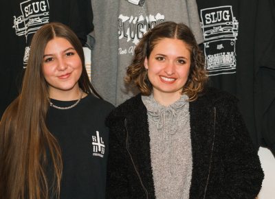 (L-R) Madi and Hilary hold down the SLUG Swag booth in Rye.