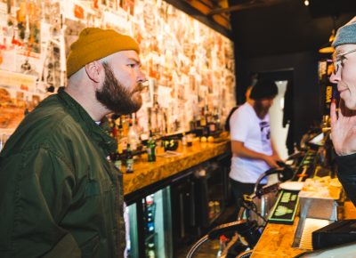 Over the loud tones of the music, a patron asks for another round at the bar.