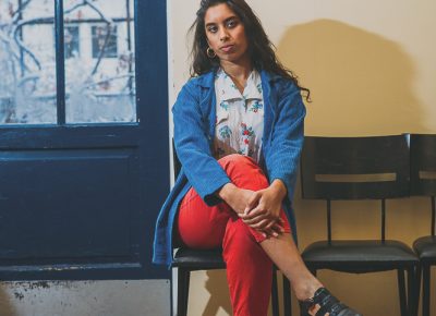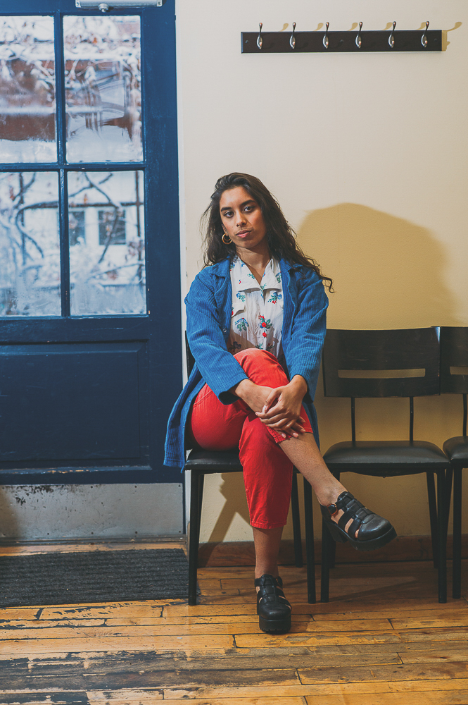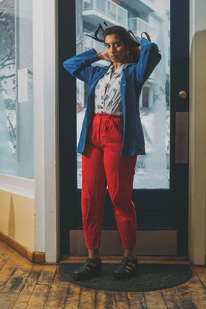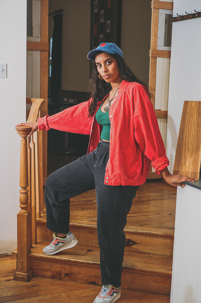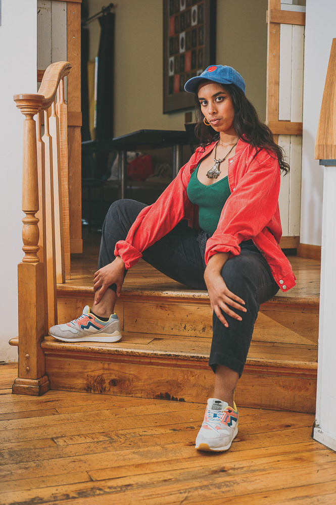 “Day to day I wear a lot of thrifted outfits,” says Abraham. “When I buy clothing I’m mostly attracted to bright colors cause that’s kind of how my art feels to me. I enjoy making color palettes, and then I feel like over time I started to adopt those color palettes into the way that I dressed.”