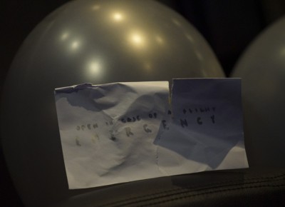 While entering the theater, all members of the audience were given a name tag with a position and an emergency envelope filled with a special item. SVC had chairs filled with silver balloons for the audience members to throw around during a part of the performance.