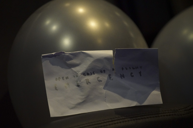 While entering the theater, all members of the audience were given a name tag with a position and an emergency envelope filled with a special item. SVC had chairs filled with silver balloons for the audience members to throw around during a part of the performance.