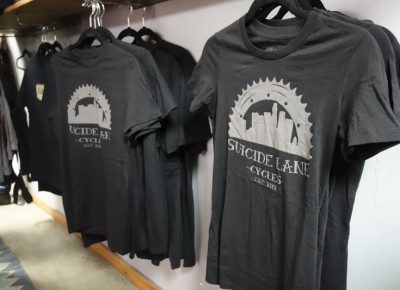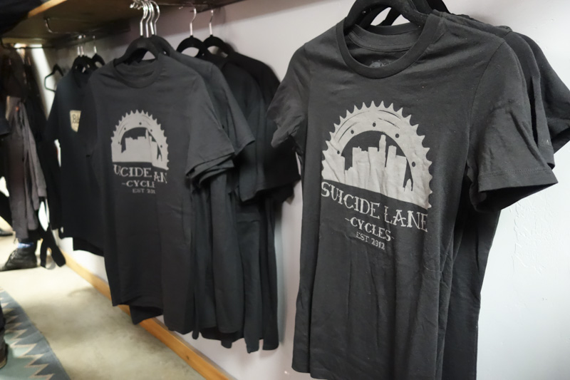 Suicide Lane Cycle T-shirts for sale in the shop. Photo by Jayson Ross.