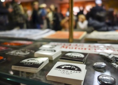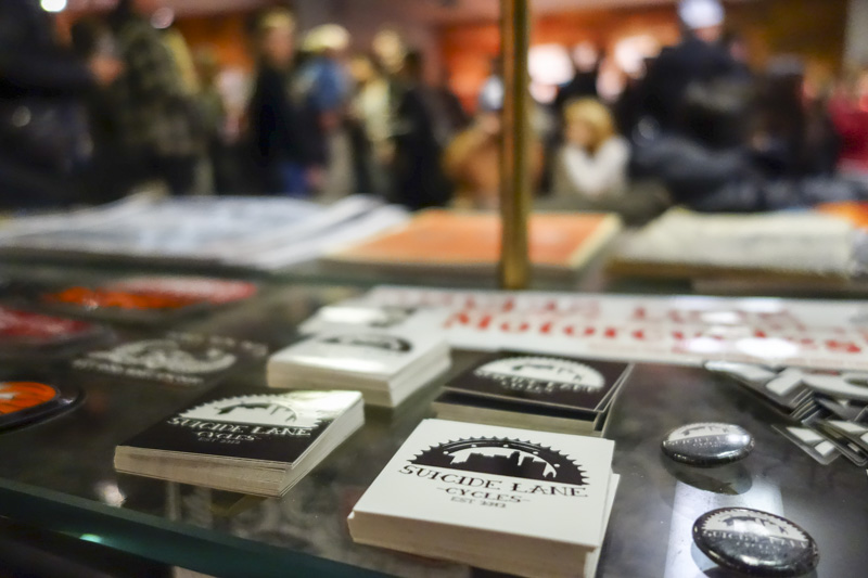 Suicide Lane Cycles stickers and pins. Photo by Jayson Ross.