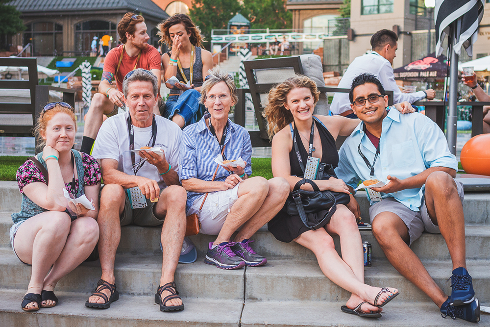 (L–R) Hannah Martineau, Phil, Deborah Byrns, Liz Kiger and Antonio Paramo have to take a seat on the steps of The Gateway’s fountain to help the unending supply of food settle. Photo: Talyn Sherer