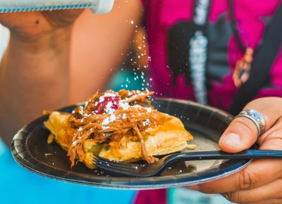 Cheddar-Poblano Waffle, topped with pulled pork, cherry habanero glaze and