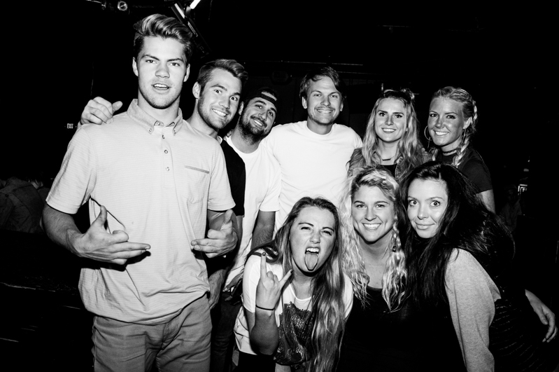 (L–R) Nadia, Scott, Austin, Erick, Robert and Jordan pose for a quick picture after The Sounds’ set. Photo: Gilbert Cisneros