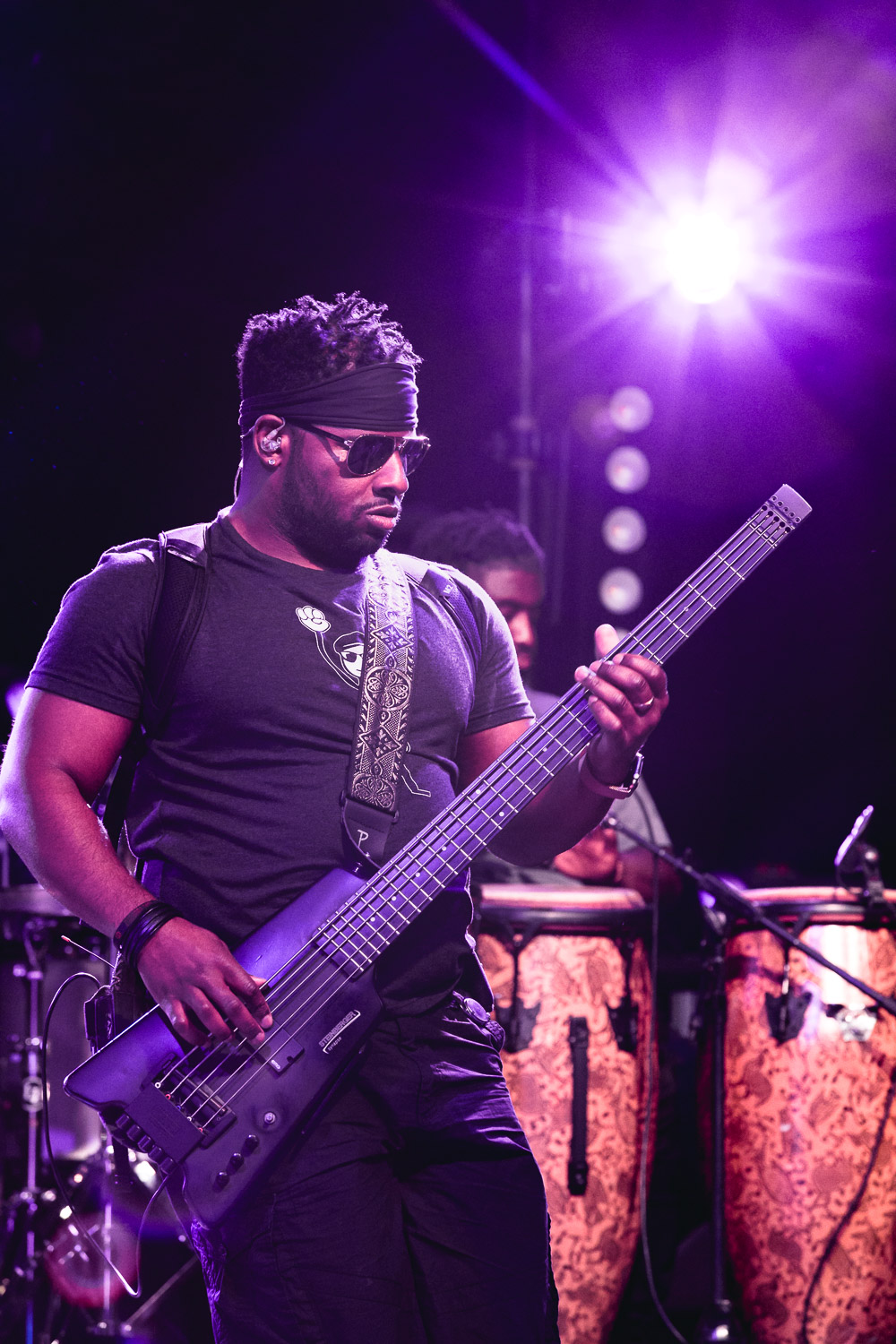 Mike Bass-Bailey playing bass guitar during the show at Red Butte Amphitheatre. Photo: Lmsorenson.net