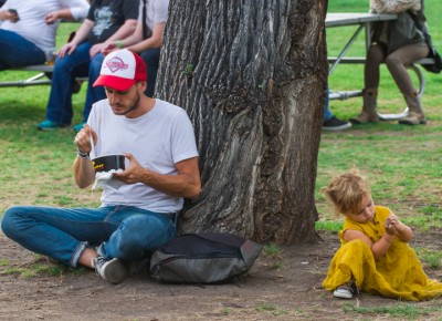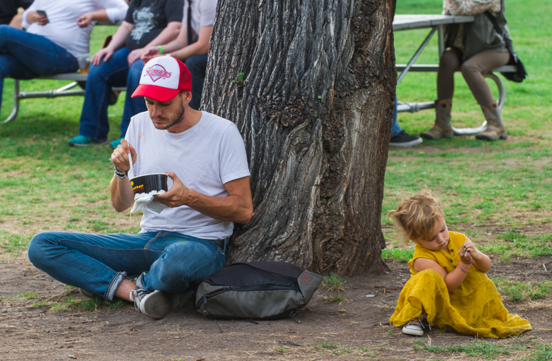 A father/daughter duo takes a quick rest to eat some Cup Bop and contemplate the intricacies of dirt. Photo: Talyn Sherer