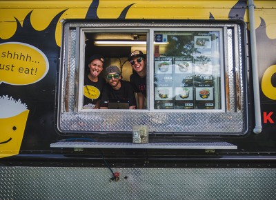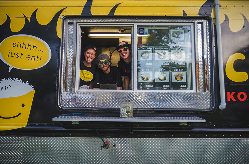 (L–R) CupBop’s Dakota Hallmark, Dereck Sherer and Dezera Firouzi served up some Korean-style Seoul food to pair with Lee Fields & The Expressions iconic style. Photo: Talyn Sherer
