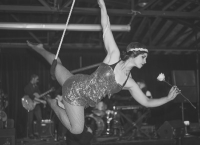 Amber Pearson performs on the trapeze in front of hundreds of attendees. Photo: Tyson Call @clancycoop