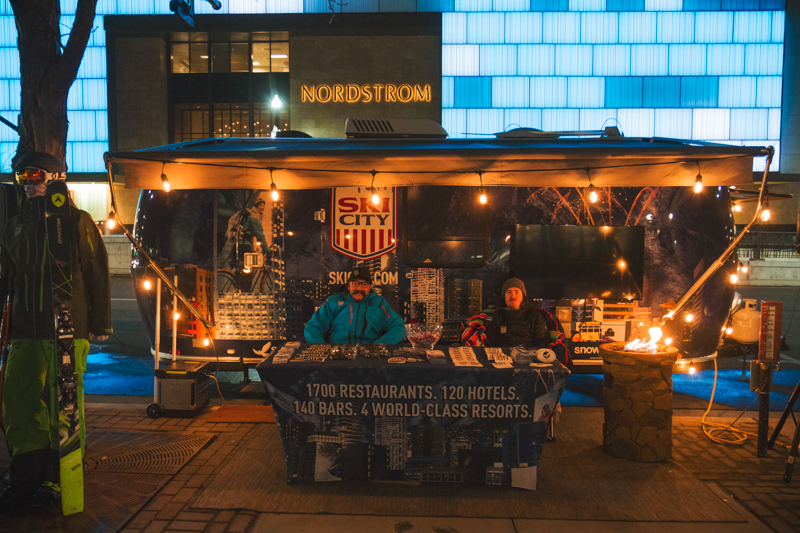 Reps from Ski Utah post up outside the UMOCA opening to talk shop with passing strangers and locals looking to score some stickers and other swag. Photo: talynsherer.com