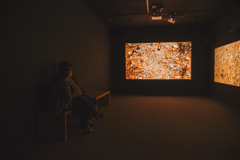 Yoshua Okón’s “Oracle” plays out on the three screens inside a secluded room as a couple gazes in awe at its abstract meaning. Photo: talynsherer.com