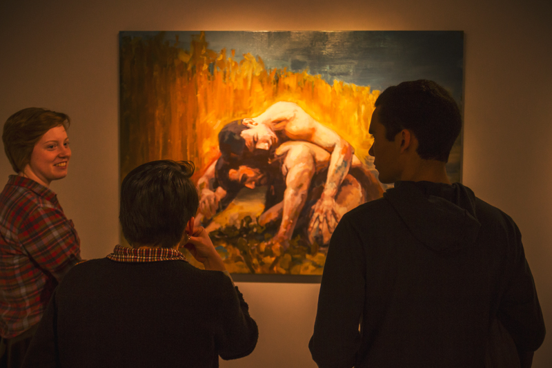 UMOCA’s entrance display showcases artist Andrew Moncrief’s “A Strange Feeling” paintings which recall Olympian wrestling statues from ancient Greece. Photo: talynsherer.com