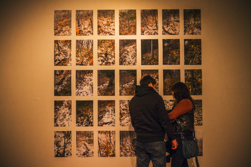 A couple gets intimate as they cuddle up to Paul Crow’s “Trail Two, Autumn” display. Photo: talynsherer.com
