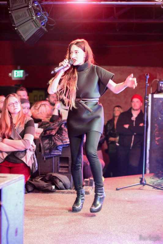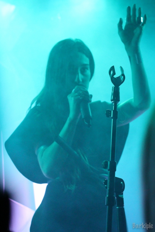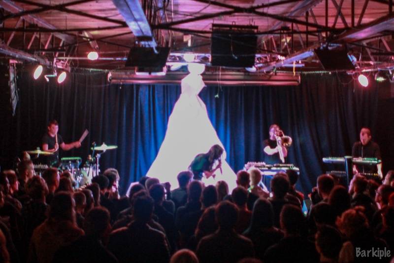 Deradoorian opened for Zola Jesus at the Urban Lounge on January 12, 2015. Angel and Arlene Deradoorian filled the lounge with etheral electro synth beats in advance of Zola Jesus’ punchy vocals. Drummer Mikey Pinaud, trombonist Daniel Eaton, and keyboardist Alex DeGroot joined vocalist Nika Danilova on this first leg of the Taiga tour, and they performed in front of a huge, lighted structure shrouded in fog.