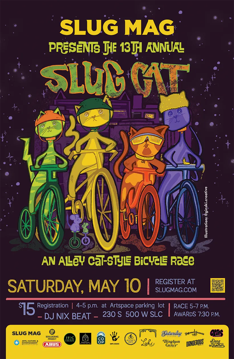 Every year SLUG Mag hosts the SLUG Cat bike race to celebrate SLC’s vibrant bike community. Inspired by the scavenger hunt-style bicycle races made popular by bike messengers in places like New York and San Francisco, SLUG Cat has become an unparalleled event in the community and is a must for all local riders, whether you’ve been cycling for years or are still on training wheels.