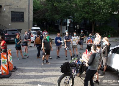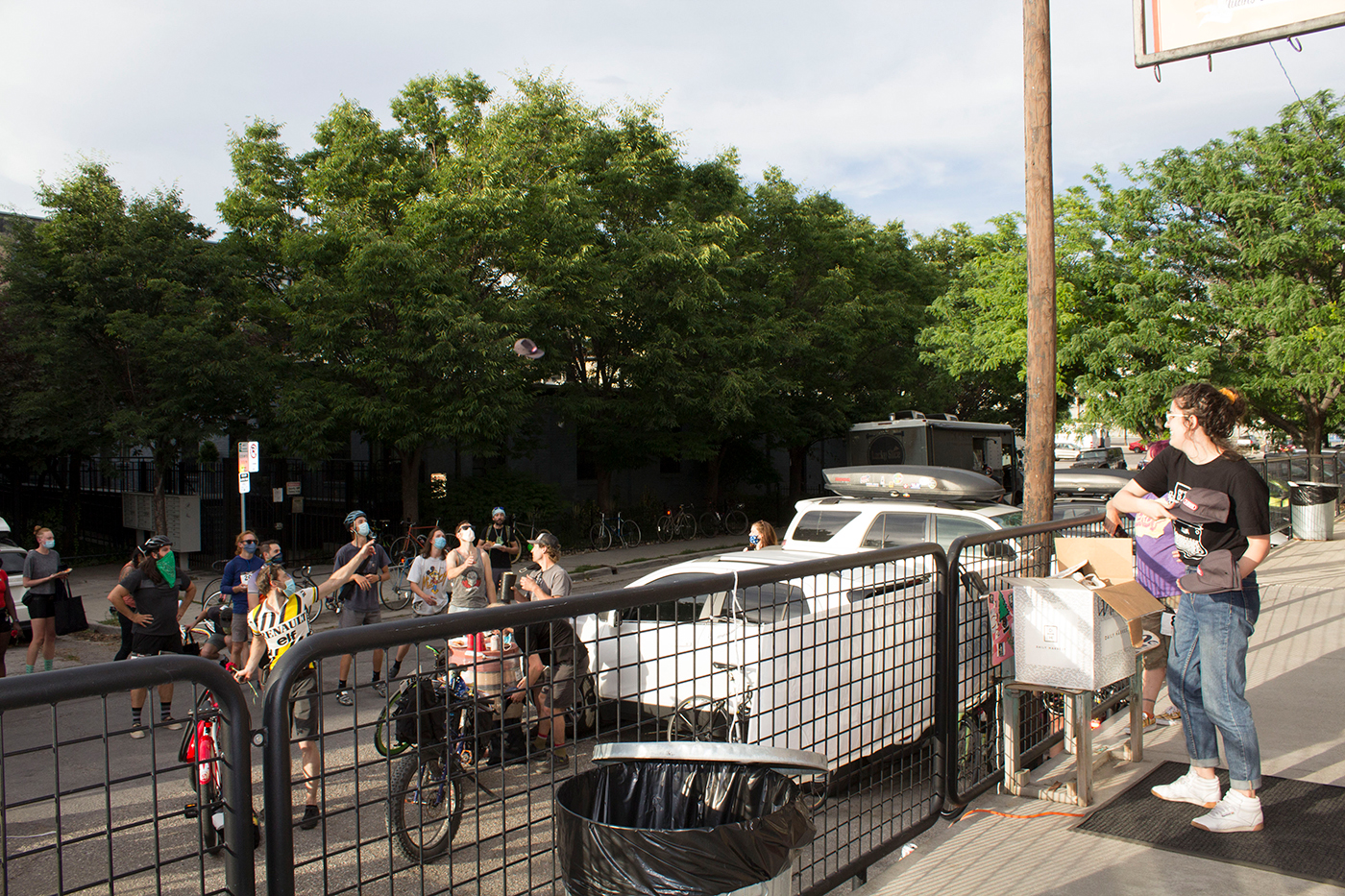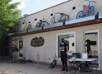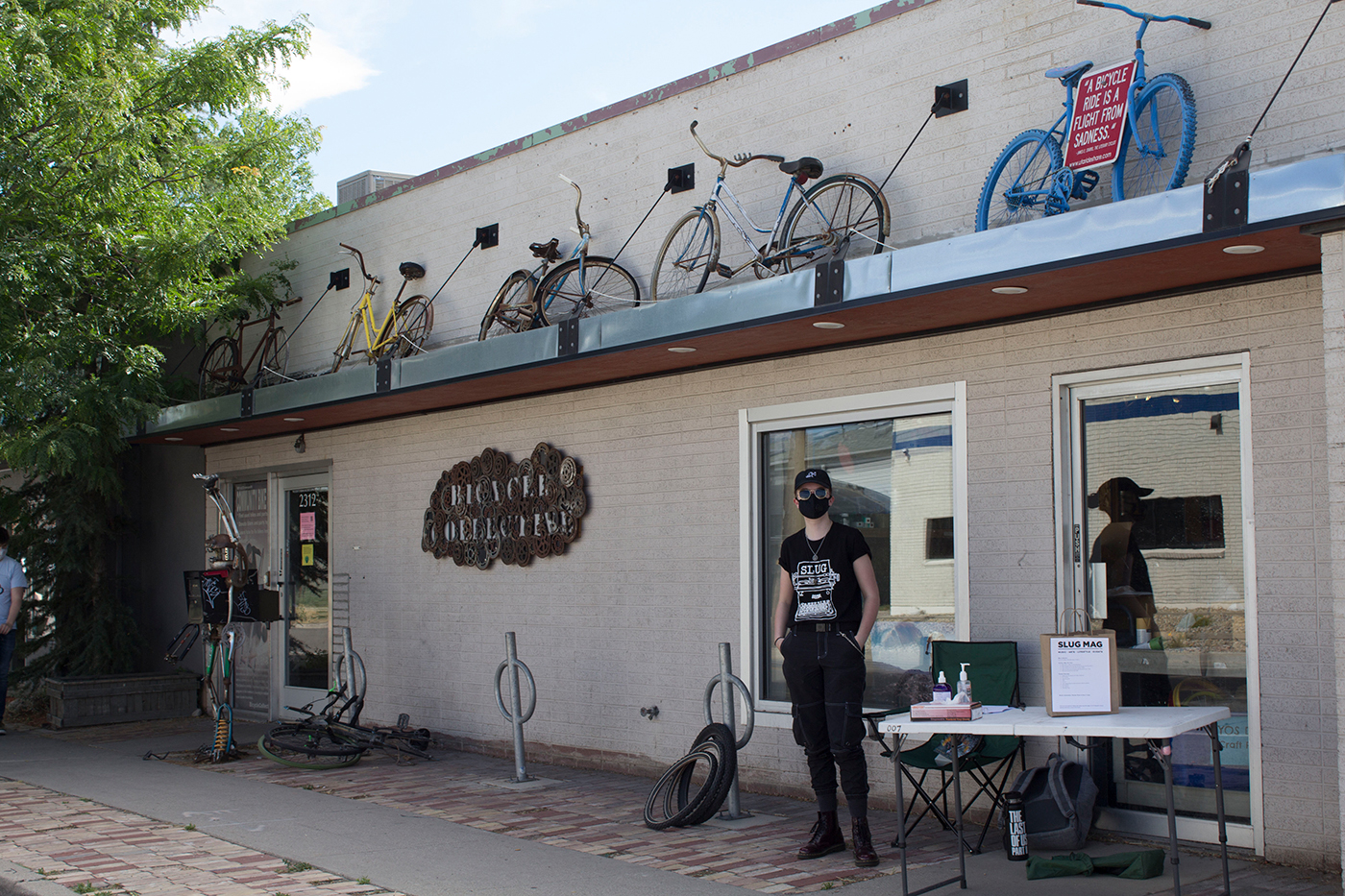 A SLUG Cat volunteer represents SLUG in front of the SLC Bicycle Collective.